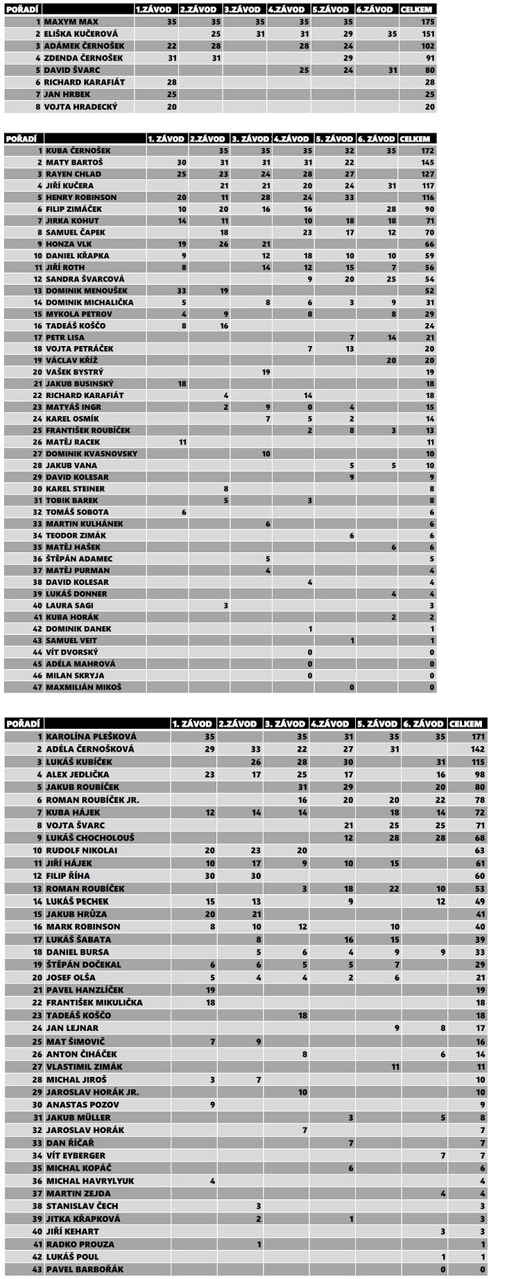 ZÁVOD: 1. místo - 25 bodů, 2. místo - 22 bodů, 3. místo - 20 bodů, 4. místo - 18 bodů, 5. místo - 16 bodů, 6. místo - 15 bodů a dále po jednom bodu