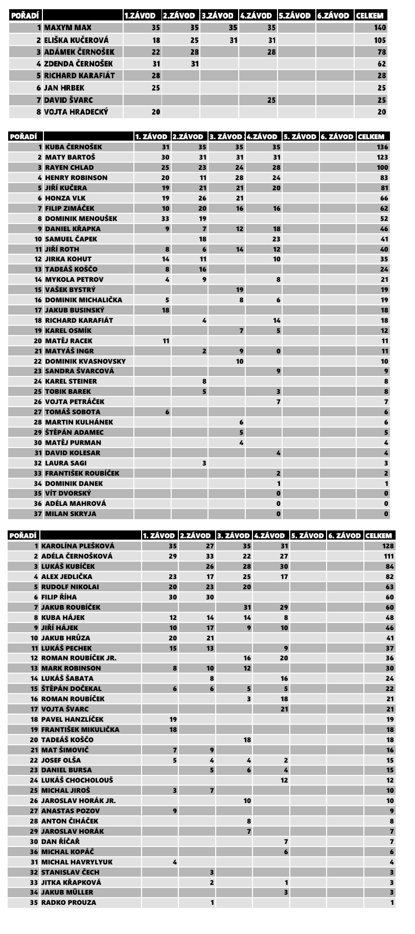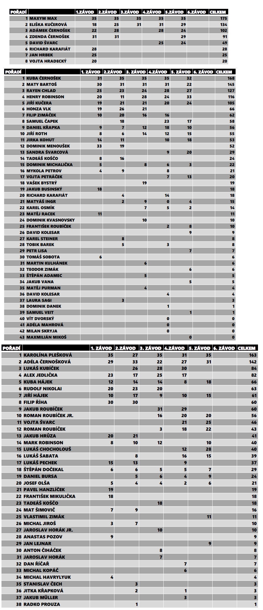 ZÁVOD: 1. místo - 25 bodů, 2. místo - 22 bodů, 3. místo - 20 bodů, 4. místo - 18 bodů, 5. místo - 16 bodů, 6. místo - 15 bodů a dále po jednom bodu